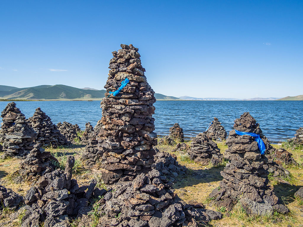 An immense mass of white-hot lava once blocked the bed of the River Terkh and it is water formed Lake Terkhiin Tsagaan, which is 16 kilometers in length, 20 meters in depth, and 61 square kilometers in this area. It is situated at an altitude of 2.060 meters. River Suman, cascading from the lake in stormy torrents, pierced through the rocks to form a canyon and several small lakes. The waters of the river are so turbulent that they do not freeze in the severest winter frosts. In the middle of the lake, there is volcanic Island is covered with nests made of the fragrant grass Sam Khan. Here all day long you hear the hum and cries of birds and the quacking of ruddy shell duck and many types of ducks and geese &. Red deer, Siberian deer, wild bear, Great Cormorant is common in summer, nesting around the lake.