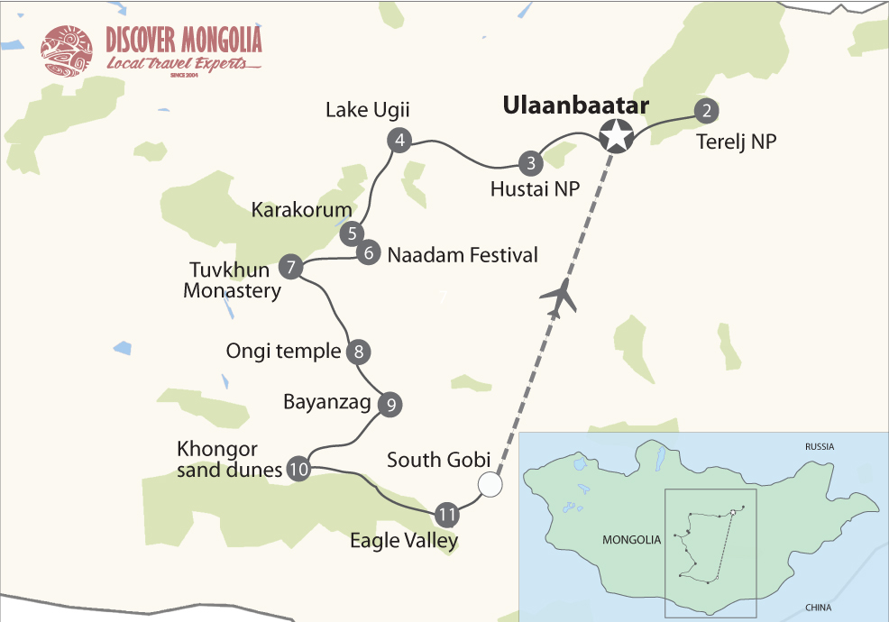 If you want to explore exotic and untouched places, one of the best ways is our “Beauty of Mongolia Tour”. This trip allows you to visit a wide assortment of beautiful and wonderful places in Mongolia, including sand dunes in the Gobi Desert, vast steppe & mountains, freshwater lakes and rivers, ancient monasteries and temples.