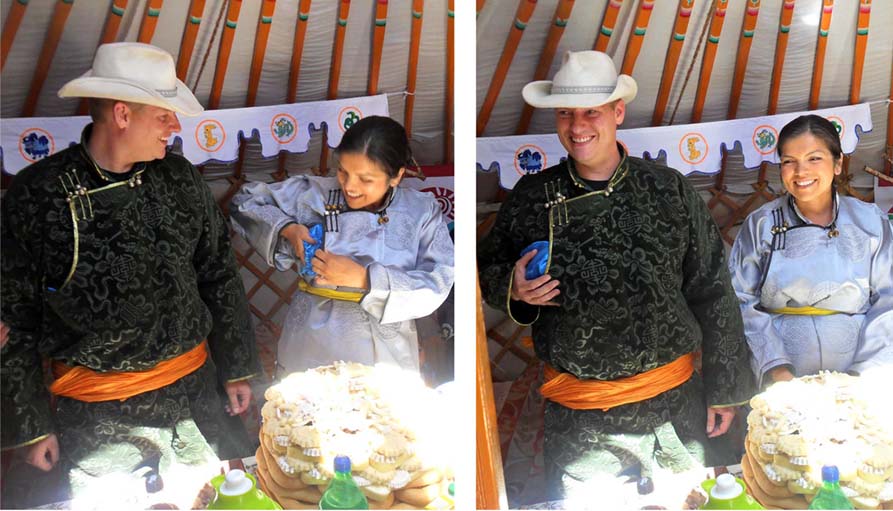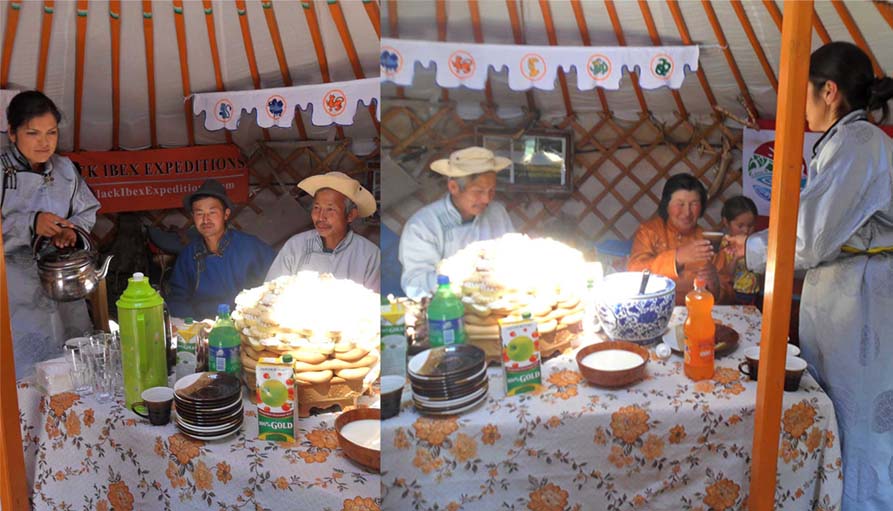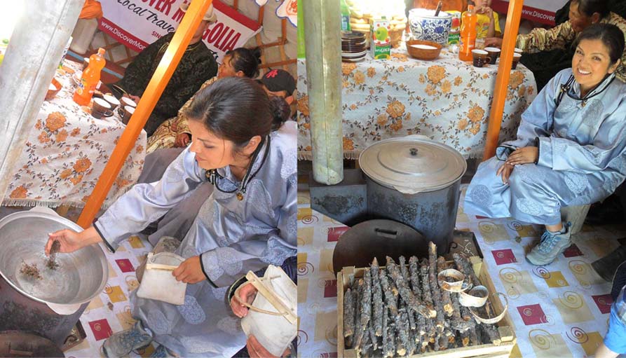 Put tea leaves into warm water and make it boil. Leave the tea boiling for a while until it turns really black! Pour the tea onto boiled milk. After a while, add salt and mare milk oil and ladle the tea several times. Zakhchin people serve this tea in an open pot and drink it while it’s hot.