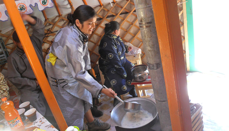 Put millet and tea leaves into water and boil it. Then add milk, salt and yellow butter (melted butter from livestock). While serving, make sure to stir the tea well. Dariganga people love to mix millet from tea with cookies fried in butter, curds, and clotted cream.