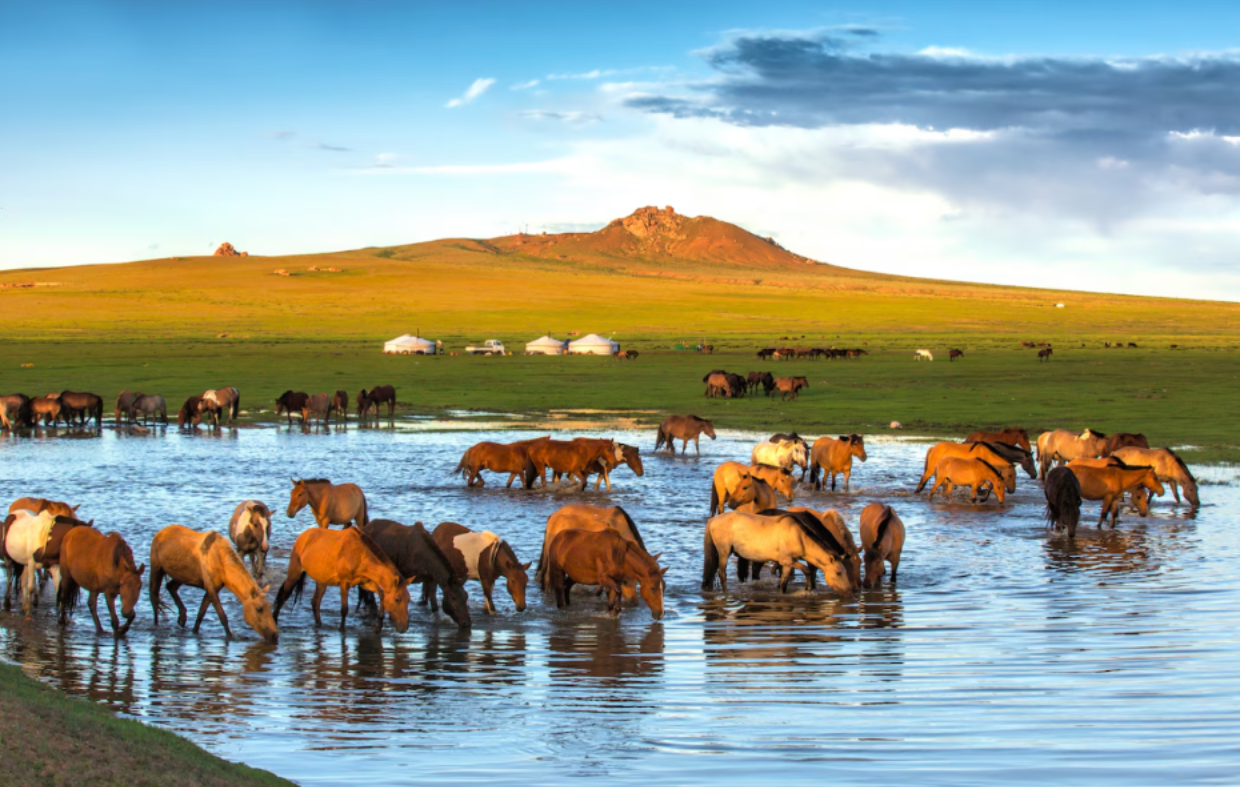 Serene, wide-angle view of a herd of Mongolian horses at a watering hole on the open steppeEven without formal practice, Tengriist values continue to shape modern Mongolian cultural identity. Respect for elders and ancestors remains central to family and social life, while a strong connection to the land, animals, and natural cycles influences daily activities.