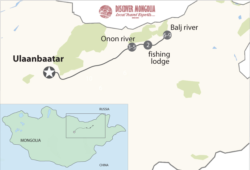 After breakfast at the camp, we will drive about 60 km to our fishing lodge to catch Taimen. The lodge is located in the bank of the Balj River which flows into Onon River.