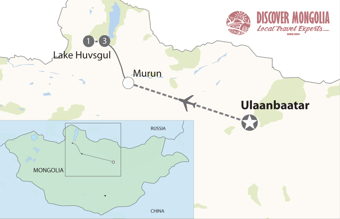 Meet in UB and fly to the capital of the Khuvsgul province, Murun. The flight takes one and a half hours, and on arrival at the airstrip in the Murun a local driver, who will take you to Khuvsgul lake National Park, will meet you.